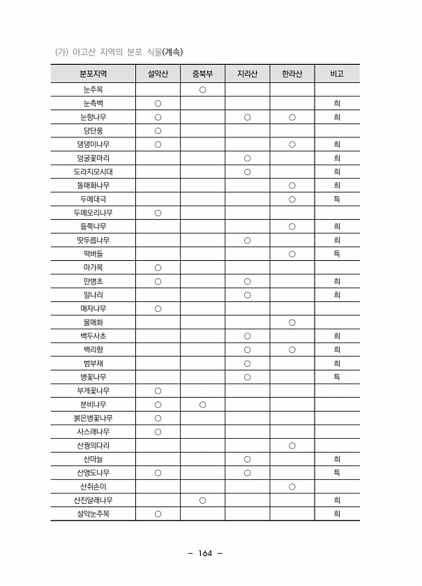 164 가 아고산 지역의 분포 식물 계속 분포지역 설악산 중북부 지리산 한라산 비고 눈주목 ○ 눈측백 ○ 희 눈향나무 ○ ○ ○ 희 당단풍 ○ 댕댕이나무 ○ ○ 희 덩굴꽃마리 ○ 희 도라지모시대 ○ 희 돌매화나무 ○ 희 두메대극 ○ 특 두메오리나무 ○ 들쭉나무 ○ 희 땃두릅나무 ○ 희 떡버들 ○ 특 마가목 ○ 만병초 ○ ○ 희 말나리 ○ 희 매자나무 ○ 물매화 ○ 백두사초 ○ 희 백리향 ○ ○ 희 범부채 ○ 희 병꽃나무 ○ 특 부게꽃나무 ○ 분비나무 ○ ○ 붉은병꽃나무 ○ 사스래나무 ○ 산꿩의다리 ○ 산마늘 ○ 희 산앵도나무 ○ ○ 특 산쥐손이 ○ 산진달래나무 ○ 희 설악눈주목 ○희