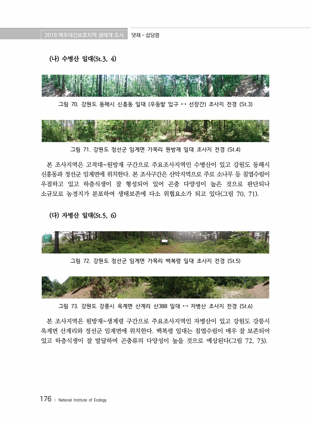 2018 백두대간보호지역 생태계 조사 댓재 삽당령 176 ? National Institute of Ecology 나 수병산 일대 St.3, 4 그림 70. 강원도 동해시 신흥동 일대 우둥밭 입구 ↔ 선장간 조사지 전경 St.3 그림 71. 강원도 정선군 임계면 가목리 원방재 일대 조사지 전경 St.4 본 조사지역은 고적대원방재 구간으로 주요조사지역인 수병산이 있고 강원도 동해시 신흥동과 정선군 임계면에 위치한다. 본 조사구간은 산악지역으로 주로 소나무 등 침엽수림이 우점하고 있고 하층식생이 잘 형성되어 있어 곤충 다양성이 높은 것으로 판단되나 소규모로 농경지가 분포하여 생태보존에 다소 위협요소가 되고 있다 그림 70, 71 다 자병산 일대 St.5, 6 그림 72. 강원도 정선군 임계면 가목리 백복령 일대...