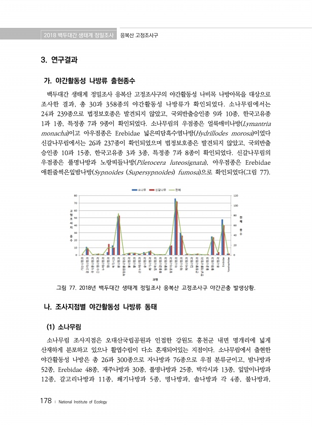 2018 백두대간 생태계 정밀조사 응복산 고정조사구 178 ? National Institute of Ecology 3. 연구결과 가. 야간활동성 나방류 출현종수 백두대간 생태계 정밀조사 응복산 고정조사구의 야간활동성 나비목 나방아목을 대상으로 조사한 결과, 총 30과 358종의 야간활동성 나방류가 확인되었다. 소나무림에서는 24과 239종으로 법정보호종은 발견되지 않았고, 국외반출승인종 9과 10종, 한국고유종 1과 1종, 특정종 7과 9종이 확인되었다. 소나무림의 우점종은 얼룩매미나방 Lymantria monacha 이고 아우점종은 Erebidae 넓은띠담흑수염나방 Hydrillodes morosa 이었다 신갈나무림에서는 26과 237종이 확인되었으며 법정보호종은 발견되지 않았고, 국외반출 승인종 10과...