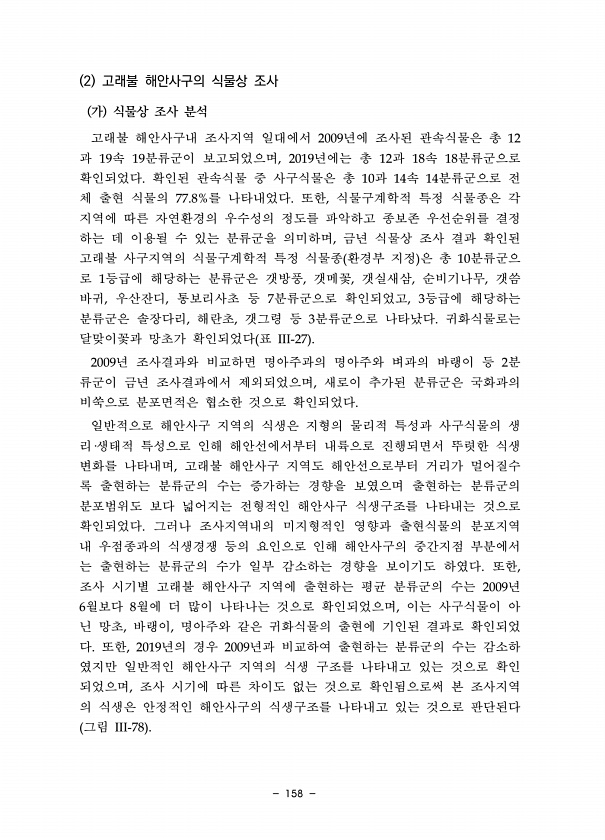 158 2 고래불 해안사구의 식물상 조사 가 식물상 조사 분석 고래불 해안사구내 조사지역 일대에서 2009년에 조사된 관속식물은 총 12 과 19속 19분류군이 보고되었으며, 2019년에는 총 12과 18속 18분류군으로 확인되었다. 확인된 관속식물 중 사구식물은 총 10과 14속 14분류군으로 전 체 출현 식물의 77.8%를 나타내었다. 또한, 식물구계학적 특정 식물종은 각 지역에 따른 자연환경의 우수성의 정도를 파악하고 종보존 우선순위를 결정 하는 데 이용될 수 있는 분류군을 의미하며, 금년 식물상 조사 결과 확인된 고래불 사구지역의 식물구계학적 특정 식물종 환경부 지정 은 총 10분류군으 로 1등급에 해당하는 분류군은 갯방풍, 갯메꽃, 갯실새삼, 순비기나무, 갯씀 바귀, 우산잔디, 통보리사초 등 7분류...