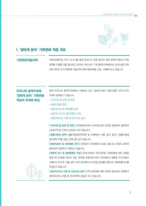 국제사회에서는 IPCC 보고서를 통해 온실가스 감축 중심의 완화 정책과 별도로 적응 정책을 수립할 것을 명시하고 있으며, 우리나라 17개 광역지자체에서는 2016년을 전후 하여 제2차 국가기후변화 적응대책 세부시행계획을 수립·이행해 오고 있습니다. 기후변화적응대책 1. ‘생태계 분야’ 기후변화 적응 개요 현재 우리나라 광역지자체에서 수행하고 있는 ‘생태계 분야’ 적응사업은 크게 5가지 주제로 분류할 수 있습니다. ?서식지와 종 보전 및 복원 ?생물다양성 정책 ?생태계교란 및 외래생물 관리 ?생태계 조사 및 생태현황도 작성 ?생태계서비스 이용 및 보전시설 설치 [서식지와 종 보전 및 복원] 기후변화에 따른 서식지와 종의 보전은 생태축과 생태면적 보호지역 등 관리가 중심이 되고 있습니다. [ 생물다양성 정책 ]...