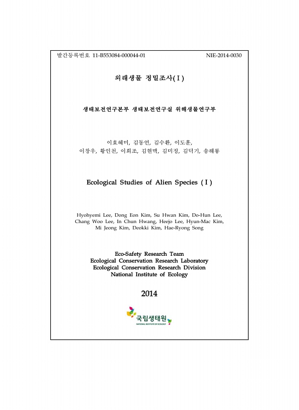 발간등록번호 11-B553084-000044-01 NIE-2014-0030 외래생물 정밀조사 Ⅰ 생태보전연구본부 생태보전연구실 위해생물연구부 이효혜미, 김동언, 김수환, 이도훈, 이창우, 황인천, 이희조, 김현맥, 김미정, 김덕기, 송해룡 Ecological Studies of Alien Species Ⅰ Hyohyemi Lee, Dong Eon Kim, Su Hwan Kim, Do-Hun Lee, Chang Woo Lee, In Chun Hwang, Heejo Lee, Hyun-Mac Kim, Mi Jeong Kim, Deokki Kim, Hae-Ryong Song Eco-Safety Research Team Ecological Conservation Research Laboratory Ecological...