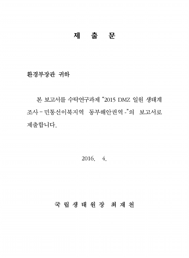 제 출 문 환경부장관 귀하 본 보고서를 수탁연구과제 “2015 DMZ 일원 생태계 조사 ? 민통선이북지역 동부해안권역 -”의 보고서로 제출합니다. 2016. 4. 국 립 생 태 원 장 최 재천