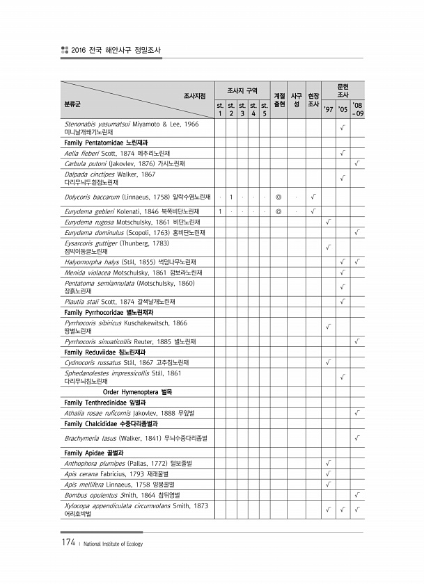 2016 전국 해안사구 정밀조사 174 ? National Institute of Ecology 조사지점 분류군 조사지 구역 계절 출현 사구 성 현장 조사 문헌 조사 st. 1 st. 2 st. 3 st. 4 st. 5 ’97 ’05 09 ’08 Stenonabis yasumatsui Miyamoto & Lee, 1966 미니날개쐐기노린재 √ Family Pentatomidae 노린재과 Aelia fieberi Scott, 1874 메추리노린재 √ Carbula putoni Jakovlev, 1876 가시노린재 √ Dalpada cinctipes Walker, 1867 다리무늬두흰점노린재 √ Dolycoris baccarum Linnaeus, 1758 알락수염노린재 1 ◎ √ Euryde...
