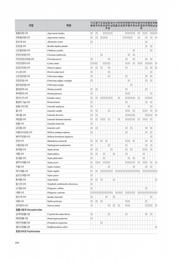 184 흰줄표범나비 Argyronome laodice ○ ○ ○ ○ ○ ○ ○ ○ ○ ○ ○ ○ ○ ○ ○ ○ 큰흰줄표범나비 Argyronome ruslana ○ ○ ○ ○ ○ ○ ○ ○ ○ ○ ○ ○ ○ 밤오색나비 Athymodes nycteis ○ ○ 큰표범나비 Brenthis daphne fumida ○ ○ 산은줄표범나비 Childrena zenobia ○ ○ 은점선표범나비 Clossiana euphrosyne ○ ○ ○ 작은은점선표범나비 Clossiana perryi ○ ○ ○ ○ ○ ○ 작은멋쟁이나비 Cyntia cardui ○ ○ ○ ○ ○ ○ ○ ○ ○ ○ ○ ○ ○ ○ ○ 암검은표범나비 Damora sagana ○ ○ ○ ○ ○ ○ ○ ○ 수노랑나비 Dravira ulupi morii ○ ○ ...