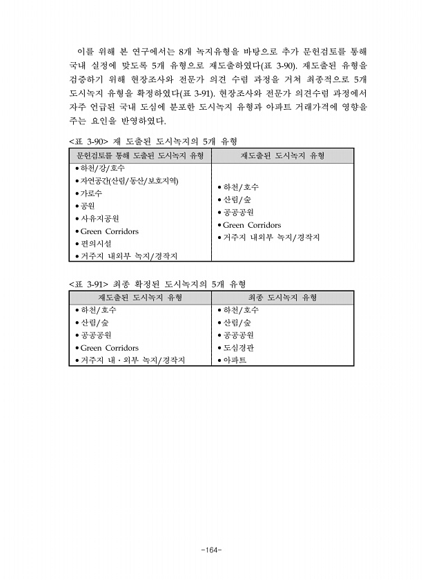 -164- 이를 위해 본 연구에서는 개 녹지유형을 바탕으로 추가 문헌검토를 통해 국내 실정에 맞도록 개 유형으로 재도출하였다 표 재도출된 유형을 검증하기 위해 현장조사와 전문가 의견 수렴 과정을 거쳐 최종적으로 개 도시녹지 유형을 확정하였다 표 현장조사와 전문가 의견수렴 과정에서 자주 언급된 국내 도심에 분포한 도시녹지 유형과 아파트 거래가격에 영향을 주는 요인을 반영하였다 문헌검토를 통해 도출된 도시녹지 유형 재도출된 도시녹지 유형 하천 강 호수 자연공간 산림 동산 보호지역 가로수 공원 사유지공원 편의시설 거주지 내외부 녹지 경작지 하천 호수 산림 숲 공공공원 거주지 내외부 녹지 경작지 표 재 도출된 도시녹지의 개 유형 재도출된 도시녹지 유형 최종 도시녹지 유형 하천 호수 산림 숲 공공공원 거주지 내 외부...