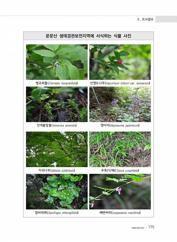 Ⅱ. 조사결과 www.nie.re.kr ? 175 운문산 생태경관보전지역에 서식하는 식물 사진 병조희풀 Clematis heracleifolia 산앵도나무 Vaccinium hirtum var. koreanum 선개불알풀 Veronica arvensis 영아자 Asyneuma japonicum 자귀나무 Albizia julibrissin 주목 식재 Taxus cuspidata 참바위취 Saxifraga oblongifolia 해변싸리 Lespedeza maritima