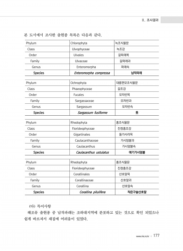 Ⅱ. 조사결과 www.nie.re.kr ? 177 본 도서에서 조사한 출현종 목록은 다음과 같다. Phylum Chlorophyta 녹조식물문 Class Ulvophyceae 녹조강 Order Ulvales 갈파래목 Family Ulvaceae 갈파래과 Genus Enteromorpha 파래속 Species Enteromorpha compressa 납작파래 Phylum Ochrophyta 대롱편모조식물문 Class Phaeophyceae 갈조강 Order Fucales 모자반목 Family Sargassaceae 모자반과 Genus Sargassum 모자반속 Species Sargassum fusiforme 톳 Phylum Rhodophyta 홍조식물문 Class Florideophyceae 진정홍조강 Or...