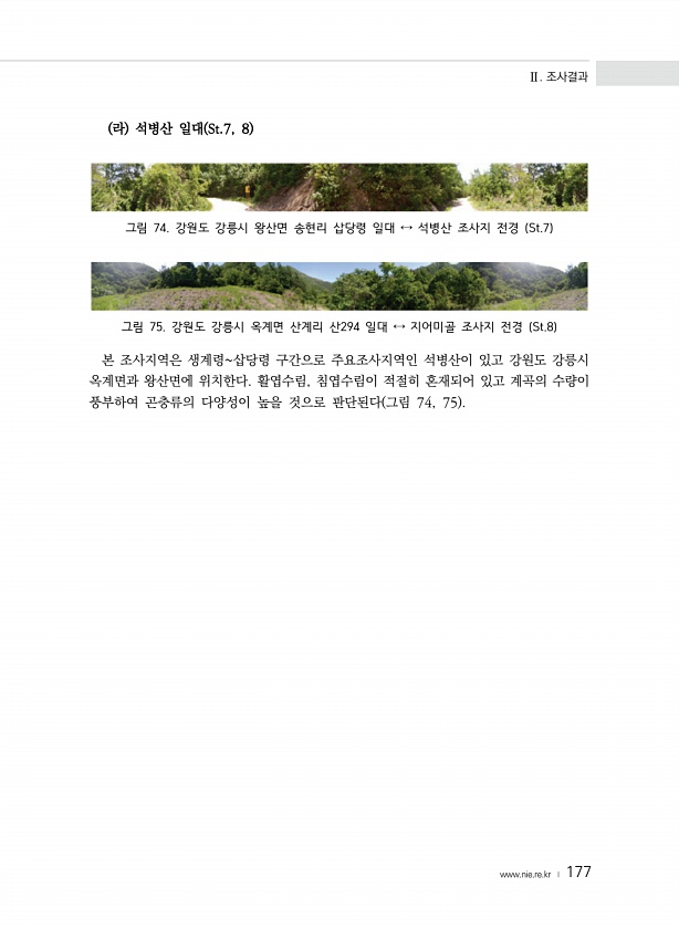 Ⅱ. 조사결과 www.nie.re.kr ? 177 라 석병산 일대 St.7, 8 그림 74. 강원도 강릉시 왕산면 송현리 삽당령 일대 ↔ 석병산 조사지 전경 St.7 그림 75. 강원도 강릉시 옥계면 산계리 산294 일대 ↔ 지어미골 조사지 전경 St.8 본 조사지역은 생계령삽당령 구간으로 주요조사지역인 석병산이 있고 강원도 강릉시 옥계면과 왕산면에 위치한다. 활엽수림, 침엽수림이 적절히 혼재되어 있고 계곡의 수량이 풍부하여 곤충류의 다양성이 높을 것으로 판단된다 그림 74, 75