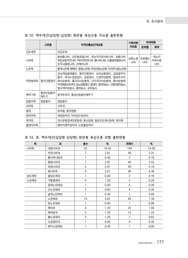 Ⅱ. 조사결과 www.nie.re.kr ? 177 목 과 종수 % 개체수 % 나비목 네발나비과 25 10.04 159 14.00 부전나비과 7 2.81 49 4.31 뿔나비나방과 1 0.40 2 0.18 팔랑나비과 7 2.81 40 3.52 호랑나비과 5 2.01 59 5.19 흰나비과 5 2.01 95 8.36 날도래목 물날도래과 1 0.40 2 0.18 노린재과 거품벌레과 3 1.20 3 0.26 광대노린재과 1 0.40 4 0.35 긴노린재과 2 0.80 4 0.35 넓적노린재과 1 0.40 1 0.09 노린재과 14 5.62 84 7.39 땅노린재과 1 0.40 1 0.09 매미과 3 1.20 22 1.94 매미충과 3 1.20 14 1.23 뿔노린재과 3 1.20 7 0.62 소금쟁이과 1 0.40...