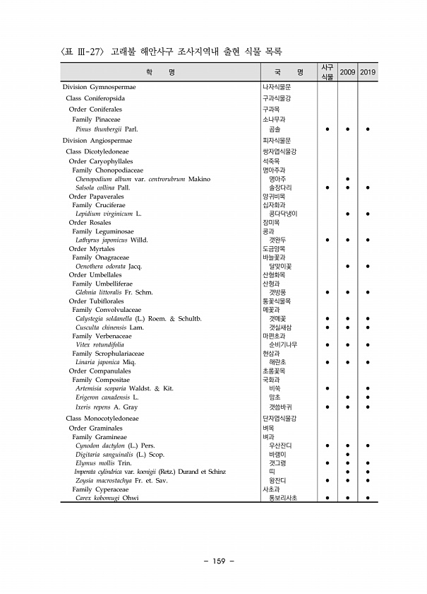 159 학 명 국 명 사구 식물 2009 2019 Division Gymnospermae 나자식물문 Class Coniferopsida 구과식물강 Order Coniferales 구과목 Family Pinaceae 소나무과 Pinus thunbergii Parl. 곰솔 ● ● ● Division Angiospermae 피자식물문 Class Dicotyledoneae 쌍자엽식물강 Order Caryophyllales 석죽목 Family Chonopodiaceae 명아주과 Chenopodium album var. centrorubrum Makino 명아주 ● Salsola collina Pall. 솔장다리 ● ● ● Order Papaverales 양귀비목 Family Cruciferae 십자화과 Lepidiu...