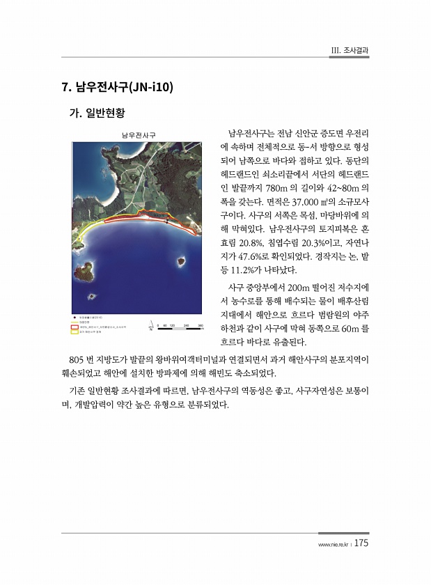 III. 조사결과 www.nie.re.kr ?175 7. JN-i10 남우전사구는 전남 신안군 증도면 우전리 에 속하며 전체적으로 동-서 방향으로 형성 되어 남쪽으로 바다와 접하고 있다. 동단의 헤드랜드인 쇠소리끝에서 서단의 헤드랜드 인 발끝까지 780m 의 길이와 4280m 의 폭을 갖는다. 면적은 37,000 ㎡의 소규모사 구이다. 사구의 서쪽은 목섬, 마당바위에 의 해 막혀있다. 남우전사구의 토지피복은 혼 효림 20.8%, 침엽수림 20.3%이고, 자연나 지가 47.6%로 확인되었다. 경작지는 논, 밭 등 11.2%가 나타났다. 사구 중앙부에서 200m 떨어진 저수지에 서 농수로를 통해 배수되는 물이 배후산림 지대에서 해안으로 흐르다 범람원의 야주 하천과 같이 사구에 막혀 동쪽으로 60m 를 흐르다 바...