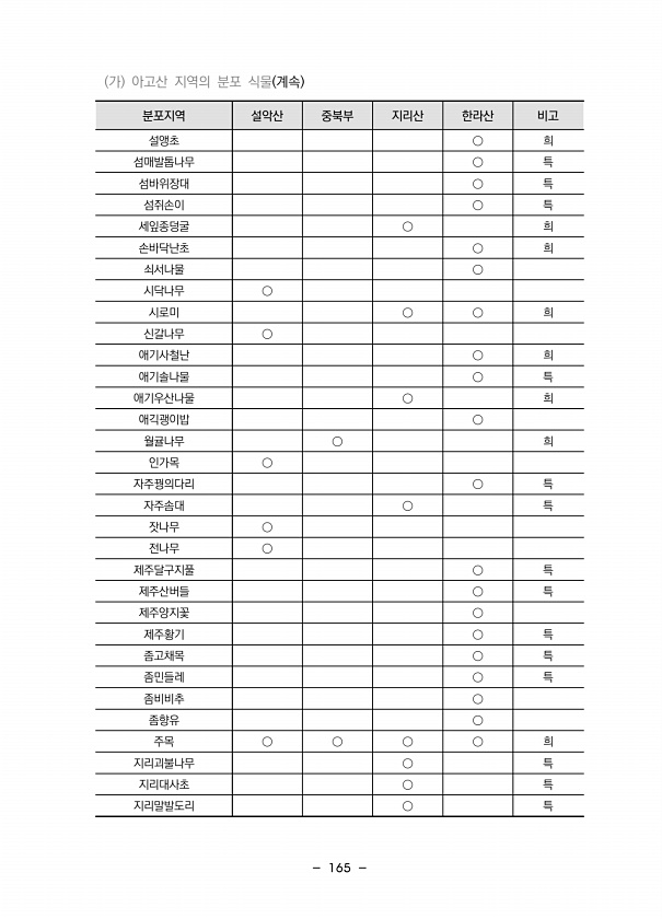 165 가 아고산 지역의 분포 식물 계속 분포지역 설악산 중북부 지리산 한라산 비고 설앵초 ○ 희 섬매발톱나무 ○ 특 섬바위장대 ○ 특 섬쥐손이 ○ 특 세잎종덩굴 ○ 희 손바닥난초 ○ 희 쇠서나물 ○ 시닥나무 ○ 시로미 ○ ○ 희 신갈나무 ○ 애기사철난 ○ 희 애기솔나물 ○ 특 애기우산나물 ○ 희 애긱괭이밥 ○ 월귤나무 ○ 희 인가목 ○ 자주꿩의다리 ○ 특 자주솜대 ○ 특 잣나무 ○ 전나무 ○ 제주달구지풀 ○ 특 제주산버들 ○ 특 제주양지꽃 ○ 제주황기 ○ 특 좀고채목 ○ 특 좀민들레 ○ 특 좀비비추 ○ 좀향유 ○ 주목 ○ ○ ○ ○ 희 지리괴불나무 ○ 특 지리대사초 ○ 특 지리말발도리 ○특
