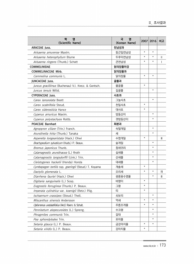 Ⅱ. 조사결과 www.nie.re.kr ? 173 학 명 Scientific Name 국 명 Korean Name 2007 2016 비고 ARACEAE Juss. 천남성과 Arisaema amurense Maxim. 둥근잎천남성 * * Arisaema heterophyllum Blume 두루미천남성 * * Ⅱ Arisaema ringens Thunb. Schott 큰천남성 * * Ⅰ COMMELINIDAE 닭의장풀아강 COMMELINACEAE Mirb. 닭의장풀과 Commelina communis L. 닭의장풀 * * JUNCACEAE Juss. 골풀과 Juncus gracillimus Buchenau V.I. Krecz. & Gontsch. 물골풀 * Juncus tenuis Willd. 길골풀 * CYP...