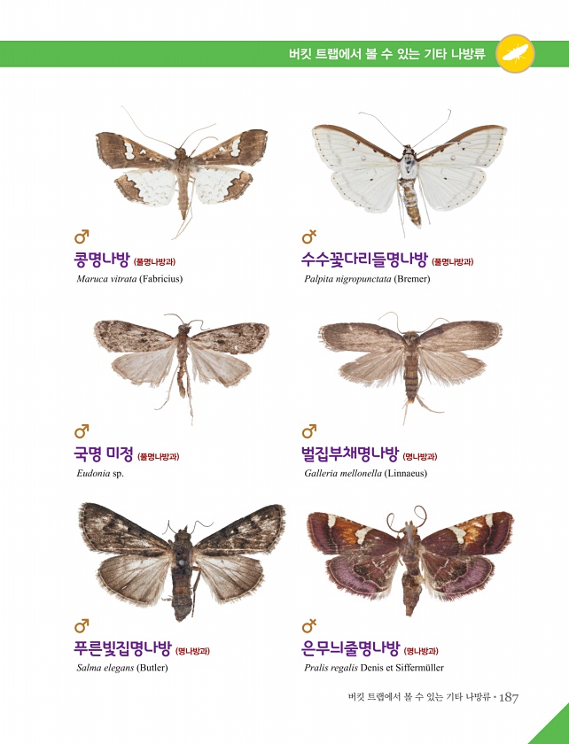 버킷 트랩에서 볼 수 있는 기타 나방류?187 버킷 트랩에서 볼 수 있는 기타 나방류 콩명나방 풀명나방과 Maruca vitrata Fabricius 수수꽃다리들명나방 풀명나방과 Palpita nigropunctata Bremer 푸른빛집명나방 명나방과 Salma elegans Butler 은무늬줄명나방 명나방과 Pralis regalis Denis et Sifferm?ller 국명 미정 풀명나방과 Eudonia sp. 벌집부채명나방 명나방과 Galleria mellonella Linnaeus