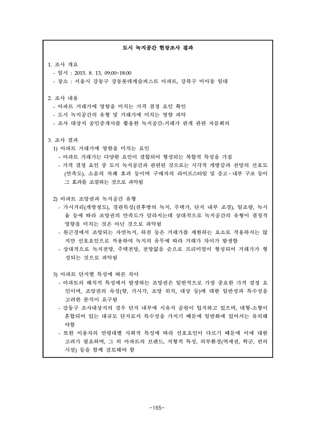 -165- 도시 녹지공간 현장조사 결과 조사 개요 일시 장소 서울시 강동구 강동롯데캐슬퍼스트 아파트 강북구 미아동 일대 조사 내용 아파트 거래가에 영향을 미치는 가격 결정 요인 확인 도시 녹지공간의 유형 및 거래가에 미치는 영향 파악 조사 대상지 공인중개사를 활용한 녹지공간 거래가 관계 관련 자문회의 조사 결과 아파트 거래가에 영향을 미치는 요인 아파트 거래가는 다양한 요인이 결합되어 형성되는 복합적 특성을 가짐 가격 결정 요인 중 도시 녹지공간과 관련된 것으로는 시각적 개방감과 전망의 선호도 만족도 소음의 차폐 효과 등이며 구매자의 라이프스타일 및 층고 내부 구조 등이 그 효과를 조절하는 것으로 파악됨 아파트 조망권과 녹지공간 유형 가시거리 개방정도 경관특성 전후방의 녹지 주택가 단지 내부 조경 일조량 녹...