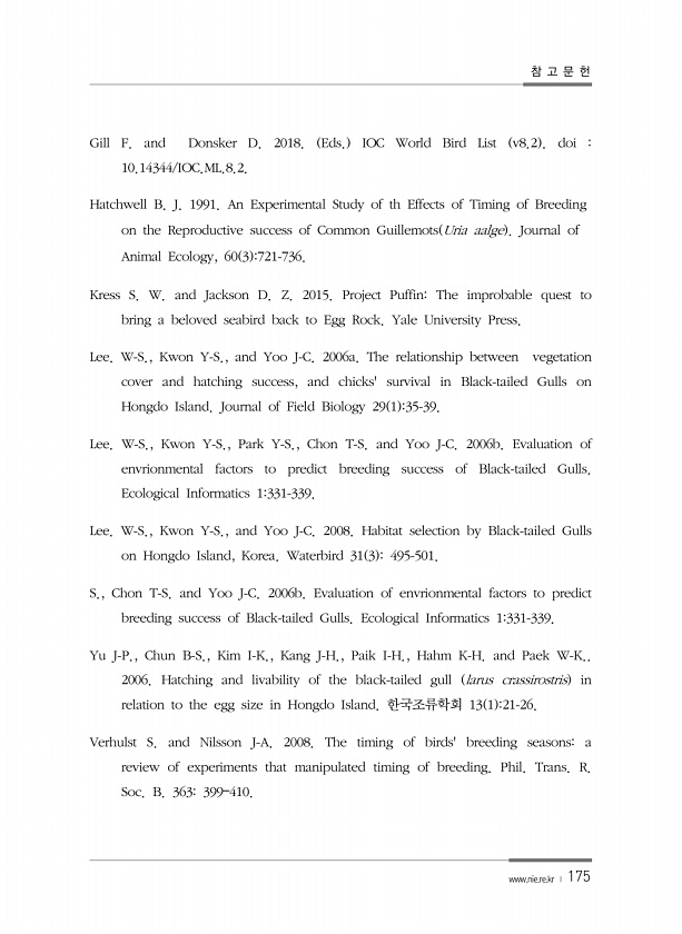 참 고 문 헌 www.nie.re.kr ? 175 Gill F. and Donsker D. 2018. Eds. IOC World Bird List v8.2 doi 10.14344/IOC.ML.8.2. Hatchwell B. J. 1991. An Experimental Study of th Effects of Timing of Breeding on the Reproductive success of Common Guillemots Uria aalge Journal of Animal Ecology, 60 3 721-736. Kress S. W. and Jackson D. Z. 2015. Project PuffinThe improbable quest to bring a beloved seabird back to E...
