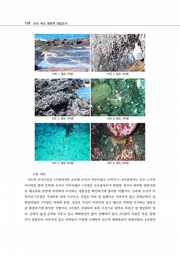 176 2015 독도 생태계 정밀조사 사진 1. 동도 1지점 사진 2. 동도 2지점 사진 3. 동도 4지점 사진 4. 동도 5지점 사진 5. 동도 6지점 사진 6. 동도 8지점 나 서도 서도의 조사구간은 1지점에서만 조간대 조사가 이루어졌고 나머지 2∼6지점에서는 모두 스쿠버 다이빙을 통한 조하대 조사가 이루어졌다. 1지점은 조수웅덩이가 발달한 경사가 완만한 암반지대 로 해조류와 암반에 부착하여 서식하는 생물상을 확인하기에 용이한 지형이다. 조하대 조사가 이 루어진 2지점은 지네바위 남쪽 구간으로 저질은 바위 및 돌멩이로 이루어져 있고 감태군락이 잘 발달하였다. 3지점은 바위와 몽돌, 자갈로 저질이 이루어져 있고 해조류 주변에 서식하는 생물상 을 관찰하기에 용이한 지형이다. 4지점은 지네바위 북쪽 구간으로 ...