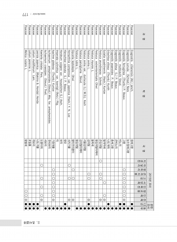 177 과 명 학 명 국 명 2015년 조사 문헌 조사 지경천 마달리 명파리 큰까치봉 고성 사양제 인북천 향로봉 인제 전체 12 년 동부 Poaceae Eragrostis cilianensis All. Janch. 참새그령 ● ● Poaceae Eragrostis curvula Schrad. Nees 능수참새그령 ● Poaceae Eragrostis ferruginea Thunb. P. Beauv. 그령 ? ? ? ? ? ? ? ◎ ● ● Poaceae Eragrostis multicaulis Steud. 비노리 ● ● Poaceae Eragrostis pilosa L. P. Beauv. 큰...