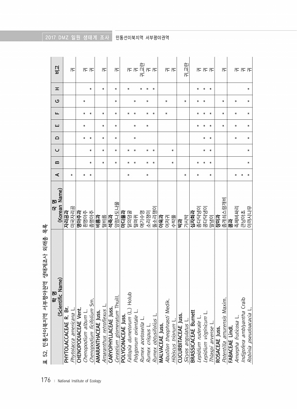 176 표 52. 민통선이북지역 서부평야권역 생태계조사 외래종 목록 학 명 Scientific Name 국 명 Korean Name A B C D E F G H 비고 PHYTOLACCACEAE R. Br. 자리공과 Phytolacca americana L. 미국자리공 * 귀 CHENOPODIACEAE Vent. 명아주과 Chenopodium album L. 흰명아주 * * * * * 귀 Chenopodium ficifolium Sm. 좀명아주 * * * * * * 귀 AMARANTHACEAE Juss. 비름과 Amaranthus retroflexus L. 털비름 * * * * * * 귀 CARYOPHYLLACEAE Juss. 석죽과 Cerastium glomeratum Thuill. 양점나도나물 * * * ...