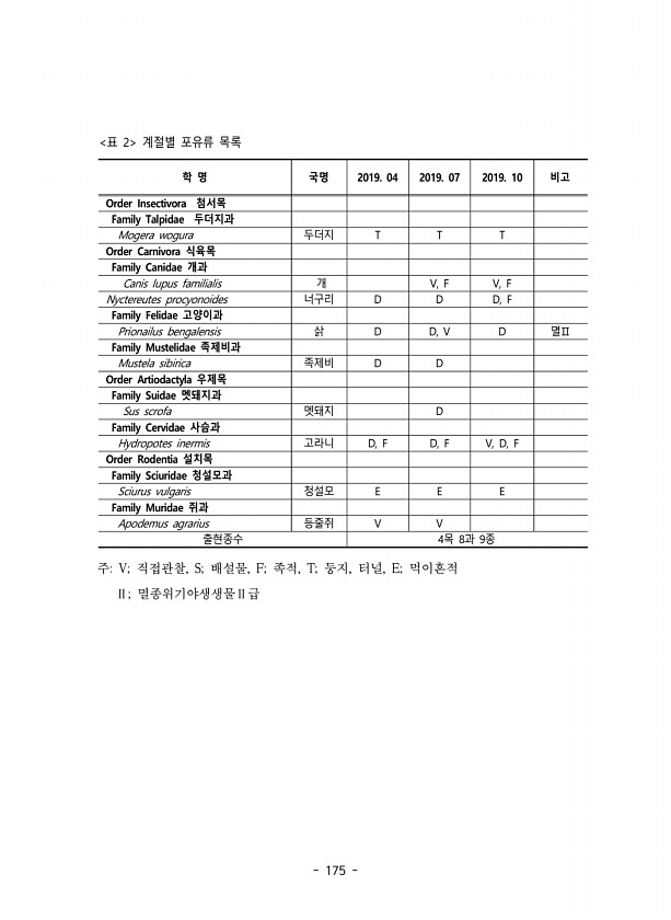 175 학 명 국명 2019. 04 2019. 07 2019. 10 비고 Order Insectivora 첨서목 Family Talpidae 두더지과 Mogera wogura 두더지 T T T Order Carnivora 식육목 Family Canidae 개과 Canis lupus familialis 개 V, F V, F Nyctereutes procyonoides 너구리 D D D, F Family Felidae 고양이과 Prionailus bengalensis 삵 D D, V D 멸Ⅱ Family Mustelidae 족제비과 Mustela sibirica 족제비 D D Order Artiodactyla 우제목 Family Suidae 멧돼지과 Sus scrofa 멧돼지 D Family Cervidae 사...