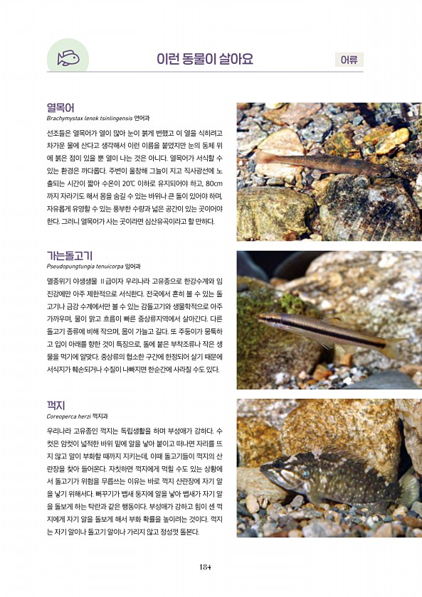184 이런 동물이 살아요 어류 꺽지 Coreoperca herzi 꺽지과 우리나라 고유종인 꺽지는 독립생활을 하며 부성애가 강하다. 수 컷은 암컷이 넓적한 바위 밑에 알을 낳아 붙이고 떠나면 자리를 뜨 지 않고 알이 부화할 때까지 지키는데, 이때 돌고기들이 꺽지의 산 란장을 찾아 들어온다. 자칫하면 꺽지에게 먹힐 수도 있는 상황에 서 돌고기가 위험을 무릅쓰는 이유는 바로 꺽지 산란장에 자기 알 을 낳기 위해서다. 뻐꾸기가 뱁새 둥지에 알을 낳아 뱁새가 자기 알 을 돌보게 하는 탁란과 같은 행동이다. 부성애가 강하고 힘이 센 꺽 지에게 자기 알을 돌보게 해서 부화 확률을 높이려는 것이다. 꺽지 는 자기 알이나 돌고기 알이나 가리지 않고 정성껏 돌본다. 가는돌고기 Pseudopungtungia tenuicor...