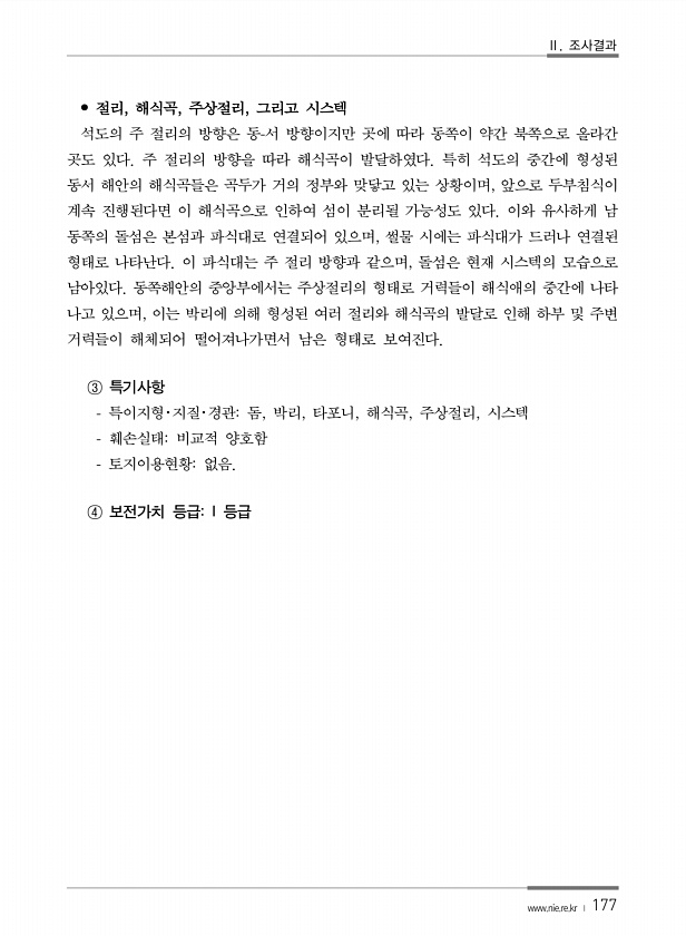 Ⅱ. 조사결과 www.nie.re.kr ? 177 ? 절리, 해식곡, 주상절리, 그리고 시스텍 석도의 주 절리의 방향은 동-서 방향이지만 곳에 따라 동쪽이 약간 북쪽으로 올라간 곳도 있다. 주 절리의 방향을 따라 해식곡이 발달하였다. 특히 석도의 중간에 형성된 동서 해안의 해식곡들은 곡두가 거의 정부와 맞닿고 있는 상황이며, 앞으로 두부침식이 계속 진행된다면 이 해식곡으로 인하여 섬이 분리될 가능성도 있다. 이와 유사하게 남 동쪽의 돌섬은 본섬과 파식대로 연결되어 있으며, 썰물 시에는 파식대가 드러나 연결된 형태로 나타난다. 이 파식대는 주 절리 방향과 같으며, 돌섬은 현재 시스텍의 모습으로 남아있다. 동쪽해안의 중앙부에서는 주상절리의 형태로 거력들이 해식애의 중간에 나타 나고 있으며, 이는 박리에 의해 형...
