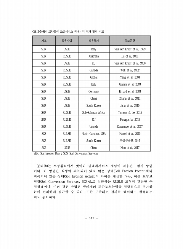 517 지표 활용방법 적용국가 참고문헌 SER USLE ltaly Van der Knijff et al, 1999 SER RUSLE Australia Lu et al, 2001 SER USLE EU Van der Knijff et al, 2000 SER RUSLE Canada Wall et al, 2002 SER RUSLE Global Yang et al, 2003 SER RUSLE ltaly Grimm et al, 2003 SER USLE Germany Erhard et al, 2003 SER USLE China Zhang et al, 2011 SER USLE South Korea Jang et al, 2015 SER RUSLE Sub-Saharan Africa Tamene & Le, 2015 SER RU...