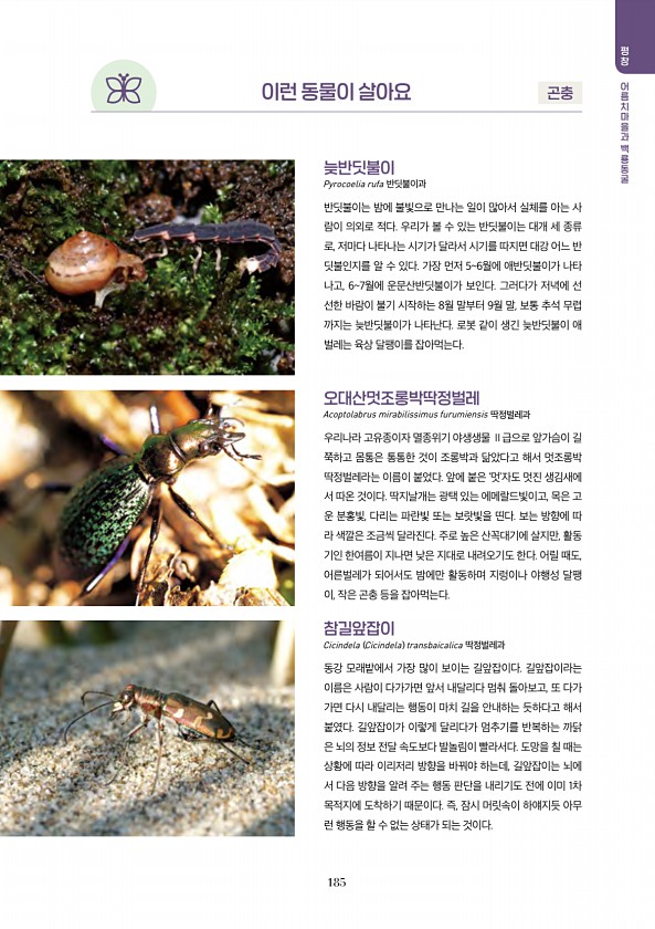 185 평창 어 어 어 어 어 어 어어 어 어 어 이런 동물이 살아요 곤충 참길앞잡이 Cicindela Cicindela transbaicalica 딱정벌레과 동강 모래밭에서 가장 많이 보이는 길앞잡이다. 길앞잡이라는 이름은 사람이 다가가면 앞서 내달리다 멈춰 돌아보고, 또 다가 가면 다시 내달리는 행동이 마치 길을 안내하는 듯하다고 해서 붙였다. 길앞잡이가 이렇게 달리다가 멈추기를 반복하는 까닭 은 뇌의 정보 전달 속도보다 발놀림이 빨라서다. 도망을 칠 때는 상황에 따라 이리저리 방향을 바꿔야 하는데, 길앞잡이는 뇌에 서 다음 방향을 알려 주는 행동 판단을 내리기도 전에 이미 1차 목적지에 도착하기 때문이다. 즉, 잠시 머릿속이 하얘지듯 아무 런 행동을 할 수 없는 상태가 되는 것이다. 늦반딧불이 Pyro...