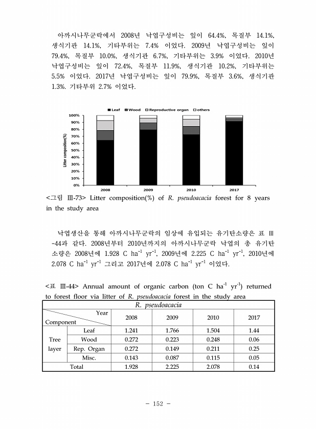 152 아까시나무군락에서 2008년 낙엽구성비는 잎이 64.4%, 목질부 14.1%, 생식기관 14.1%, 기타부위는 7.4% 이었다. 2009년 낙엽구성비는 잎이 79.4%, 목질부 10.0%, 생식기관 6.7%, 기타부위는 3.9% 이었다. 2010년 낙엽구성비는 잎이 72.4%, 목질부 11.9%, 생식기관 10.2%, 기타부위는 5.5% 이었다. 2017년 낙엽구성비는 잎이 79.9%, 목질부 3.6%, 생식기관 1.3%. 기타부위 2.7% 이었다. 그림 Ⅲ-73 Litter composition % of R. pseudoacacia forest for 8 years in the study area 낙엽생산을 통해 아까시나무군락의 임상에 유입되는 유기탄소량은 표 Ⅲ -44과 같다. 2008년부터 20...