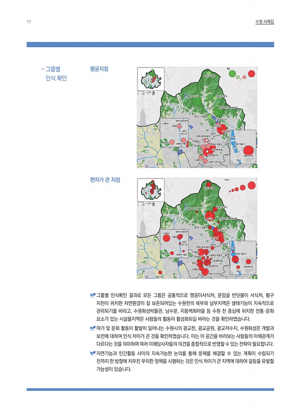 17 수원 사례집 그룹별 인식확인 결과로 모든 그룹은 공통적으로 맹꽁이서식처, 문암골 반딧불이 서식처, 황구 지천이 위치한 자연환경이 잘 보존되어있는 수원천의 북부와 남부지역은 생태기능이 지속적으로 관리되기를 바라고, 수원화성박물관, 남수문, 지동벽화마을 등 수원 천 중심에 위치한 전통·문화 요소가 있는 시설물지역은 사람들의 활동이 활성화되길 바라는 것을 확인하였습니다. 여가 및 문화 활동이 활발히 일어나는 수원시의 광교천, 광교공원, 광교저수지, 수원화성은 개발과 보전에 대하여 인식 차이가 큰 것을 확인하였습니다. 이는 이 공간을 바라보는 사람들의 이해관계가 다르다는 것을 의미하며 여러 이해당사자들의 의견을 종합적으로 반영할 수 있는 전략이 필요합니다. 자연기능과 인간활동 사이의 지속가능한 논의를 통해 문...