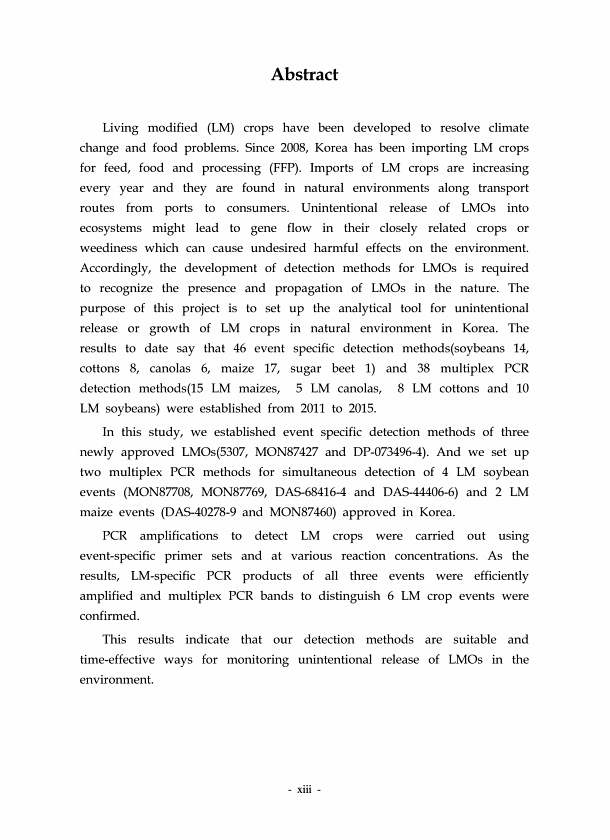 xiii Abstract Living modified LM crops have been developed to resolve climate change and food problems. Since 2008, Korea has been importing LM crops for feed, food and processing FFP Imports of LM crops are increasing every year and they are found in natural environments along transport routes from ports to consumers. Unintentional release of LMOs into ecosystems might lead to gene flow in their ...