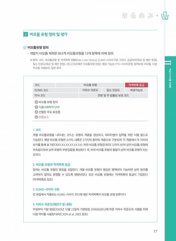 Ⅱ 독일의 비오톱 유형화 비오톱유형 정의 개발지 비오톱 제외한 863개 비오톱유형을 13개 항목에 의해 정의 ※ 항목코드, 비오톱유형 및 적색목록 현황 Rote Liste-Status , EUNIS-서식처구분, 지하수 공급여부 육상 및 해안 한정 , 질소 민감도 육상 및 해안 한정 , HELCOM 해안 비오톱유형 한정 , 재생 가능성, FFH-서식처유형, 법적보호 비오톱, 식생, 주요종, 위협요인, 일반 정의 2 비오톱 유형 정의 및 평가 코드 비오톱 유형 적색목록 등급 EUNIS 코드 지하수 의존도 질소 민감도 재생가능성 FFH 코드 연방 및 주 법률상 보호 코드 D 비오톱 유형 정의 V 식물사회학적 단위 A 선별된 주요 표징종 G 위험요소 1. 코드 개별 비오톱유형을 나타내는 코드는 유형의 계층을 생성하...