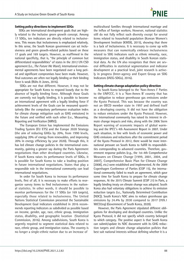 88 Setting policy directions to implement SDGs SDGs are international development goals that are highly related to the inclusive green growth concept. Among 17 SDGs, ten indicators are directly related to inclusiveness. This means that inclusiveness is emphasized relatively. In this sense, the South Korean government can set inclusiveness and green growth-related policies based on these 17 goals a...