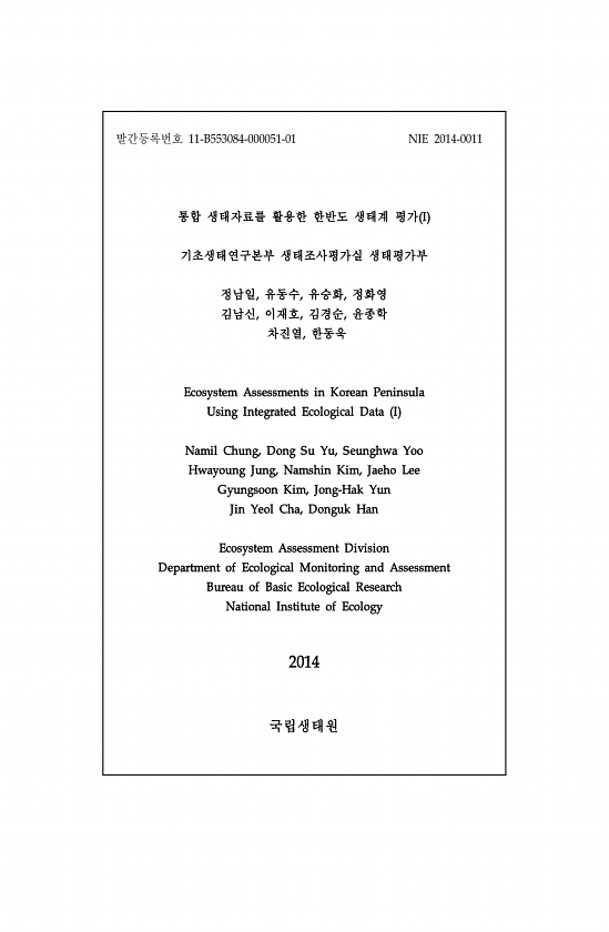 발간등록번호 11-B553084-000051-01 NIE 2014-0011 통합 생태자료를 활용한 한반도 생태계 평가 I 기초생태연구본부 생태조사평가실 생태평가부 정남일, 유동수, 유승화, 정화영 김남신, 이재호, 김경순, 윤종학 차진열, 한동욱 Ecosystem Assessments in Korean Peninsula Using Integrated Ecological Data I Namil Chung, Dong Su Yu, Seunghwa Yoo Hwayoung Jung, Namshin Kim, Jaeho Lee Gyungsoon Kim, Jong-Hak Yun Jin Yeol Cha, Donguk Han Ecosystem Assessment Division Department of Ecological M...