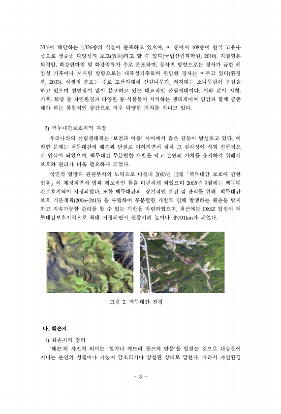 3 33%에 해당하는 1,326종의 식물이 분포하고 있으며, 이 중에서 108종이 한국 고유수 종으로 생물종 다양성의 보고 寶庫 라고 할 수 있다 국립산림과학원, 2010 지질형은 퇴적암, 화강편마암 및 화강암류가 주로 분포하며, 동사면 방향으로는 경사가 급한 해 양성 기후이나 서사면 방향으로는 내륙성기후로써 완만한 경사는 이루고 있다 환경 부, 2003 식생의 분포는 주로 고산지대에 신갈나무가, 저지대는 소나무림이 우점을 하고 있으며 천연림이 많이 분포하고 있는 대표적인 산림지대이다. 이와 같이 지형, 기후, 토양 등 자연환경과 다양한 동·식물들이 서식하는 생태계이며 인간과 함께 공존 해야 하는 복합적인 공간으로 매우 다양한 가치를 지니고 있다. 3 백두대간보호지역 지정 우리나라의 산림생태계는 ‘보전과 이...