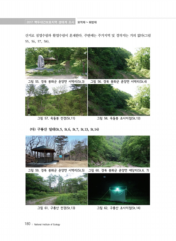 2017 백두대간보호지역 생태계 조사 묘적재 화방재 180 ? National Institute of Ecology 산지로 침엽수림과 활엽수림이 혼재한다. 주변에는 주거지역 및 경작지는 거의 없다 그림 55, 56, 57, 58 그림 55. 경북 봉화군 춘양면 서벽리 St.3 그림 56. 경북 봉화군 춘양면 서벽리 St.4 그림 57. 옥돌봉 전경 St.11 그림 58. 옥돌봉 조사지점 St.12 다 구룡산 일대 St.5, St.6, St.7, St.13, St.14 그림 59. 경북 봉화군 춘양면 서벽리 St.5 그림 60. 경북 봉화군 춘양면 애당리 St.6. 7 그림 61. 구룡산 전경 St.13 그림 62. 구룡산 조사지점 St.14