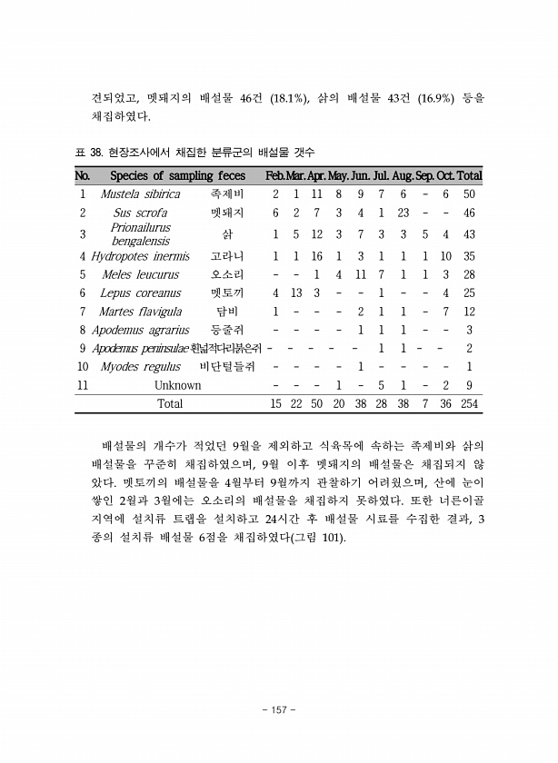 견되었고, 멧돼지의 배설물 46건 18.1% , 삵의 배설물 43건 16.9% 등을 채집하였다. No. Species of sampling feces Feb.Mar.Apr. May.Jun. Jul. Aug.Sep. Oct. Total 1 Mustela sibirica 족제비 2 1 11 8 9 7 6 6 50 2 Sus scrofa 멧돼지 6 2 7 3 4 1 23 46 3 Prionailurus bengalensis 삵 1 5 12 3 7 3 3 5 4 43 4 Hydropotes inermis 고라니 1 1 16 1 3 1 1 1 10 35 5 Meles leucurus 오소리 1 4 11 7 1 1 3 28 6 Lepus coreanus 멧토끼 4 13 3 1 4 25 7 Martes flavigula...