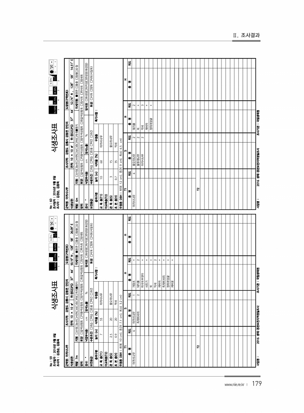 179 No 59 조사일자 2016년 9월 8일 조사자 김경순, 김동욱 식생조사표 군락명아까시나무 조사지역강원도 강릉시 강동면 안인리 도엽명 구역번호 식생상관면적10 × 10 ㎡ 위·경도 GPS 37° 44′ 50.19″N , 128° 58′ 26.09″E 해발7m 지형□산정□능선□사면 □상□중□하 □계곡■평지 미세지형■평면 □돌출 □함몰□요철 방위토양□갈색삼림토 □적황색삼림토 □암적색삼림토 □회갈색삼림토 □침식토 □미숙토 □암쇄토 경사° 낙엽부식층cm 암석노출% 암석권□화성암□퇴적암□변성암 화강암 보전등급수분조건□과습 □약습 □중용 □약건 □과건 토성□사토 □양토 □식토 사질토 층위구분 높이 m 식피율 % 우점종 특기사항 교 목 층 T1 7 55 아까시나무 아교목층 T2 관 목 층 S 2.5 20 물오리나...
