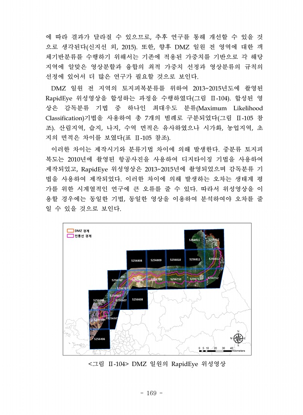 169 에 따라 결과가 달라질 수 있으므로 추후 연구를 통해 개선할 수 있을 것 으로 생각된다 신지선 외 또한 향후 일원 전 영역에 대한 객 체기반분류를 수행하기 위해서는 기존에 적용된 가중치를 기반으로 각 해당 지역에 알맞은 영상분할과 융합의 최적 가중치 선정과 영상분류의 규칙의 선정에 있어서 더 많은 연구가 필요할 것으로 보인다 일원 전 지역의 토지피복분류를 위하여 년도에 촬영된 위성영상을 합성하는 과정을 수행하였다 그림 합성된 영 상은 감독분류 기법 중 하나인 최대우도 분류 기법을 사용하여 총 개의 범례로 구분되었다 그림 참 조 산림지역 습지 나지 수역 면적은 유사하였으나 시가화 농업지역 초 지의 면적은 차이를 보였다 표 참조 이러한 차이는 제작시기와 분류기법 차이에 의해 발생한다 중분류 토지피 복도는...