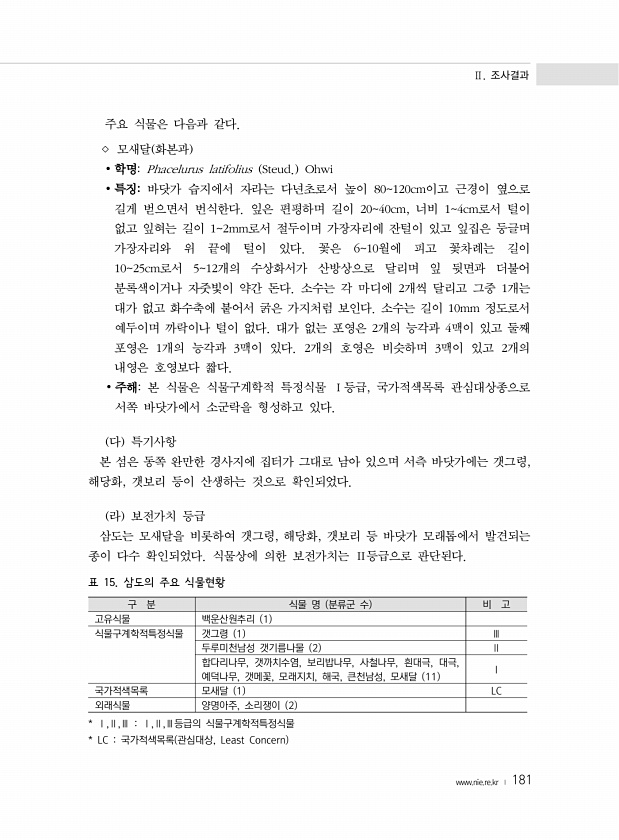 Ⅱ. 조사결과 www.nie.re.kr ? 181 주요 식물은 다음과 같다. ◇ 모새달 화본과 ? 학명Phacelurus latifolius Steud. Ohwi ? 특징바닷가 습지에서 자라는 다년초로서 높이 80120cm이고 근경이 옆으로 길게 벋으면서 번식한다. 잎은 편평하며 길이 2040cm, 너비 14cm로서 털이 없고 잎혀는 길이 12mm로서 절두이며 가장자리에 잔털이 있고 잎집은 둥글며 가장자리와 위 끝에 털이 있다. 꽃은 610월에 피고 꽃차례는 길이 1025cm로서 512개의 수상화서가 산방상으로 달리며 잎 뒷면과 더불어 분록색이거나 자줏빛이 약간 돈다. 소수는 각 마디에 2개씩 달리고 그중 1개는 대가 없고 화수축에 붙어서 굵은 가지처럼 보인다. 소수는 길이 10mm 정도로서 예두이며 까락이...