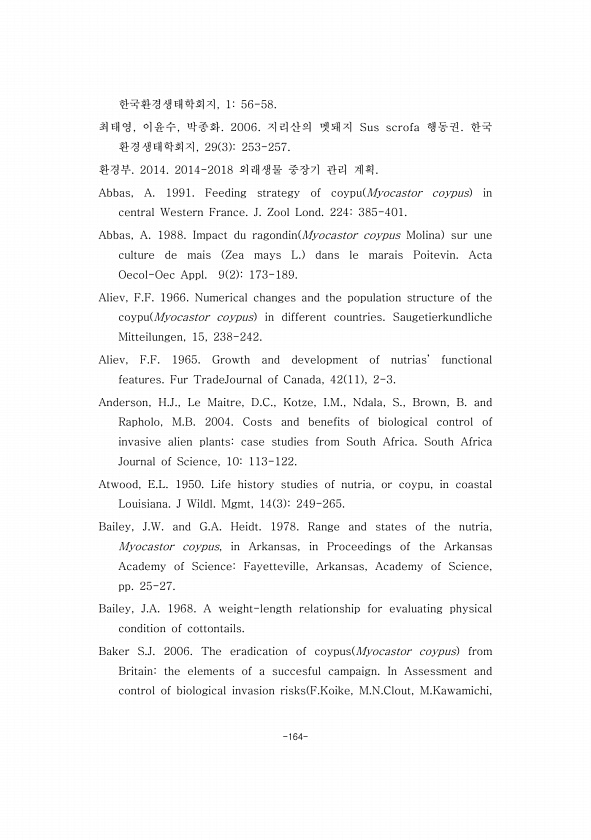 -164- 한국환경생태학회지, 156-58. 최태영, 이윤수, 박종화. 2006. 지리산의 멧돼지 Sus scrofa 행동권. 한국 환경생태학회지, 29 3 253-257. 환경부. 2014. 2014-2018 외래생물 중장기 관리 계획. Abbas, A. 1991. Feeding strategy of coypu Myocastor coypus in central Western France. J. Zool Lond. 224385-401. Abbas, A. 1988. Impact du ragondin Myocastor coypus Molina sur une culture de mais Zea mays L. dans le marais Poitevin. Acta Oecol-Oec Appl. 9 2 173-189. ...