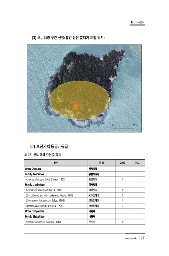 II. 조사결과 www.nie.re.kr ?177 3 학 명 국 명 2018 비고 Order Odonata 잠자리목 Family Aeshnidae 왕잠자리과 Anax parthenope julius Brauer, 1865 왕잠자리 1 Family Libellulidae 잠자리과 Orthetrum albistylum Selys, 1848 밀잠자리 6 Crocothemis servilia mariannae Kiauta, 1983 고추잠자리 2 Sympetrum infuscatum Selys, 1883 깃동잠자리 1 Pantala flavescens Fabricius, 1798 된장잠자리 7 Order Dictyoptera 바퀴목 Family Blattellidae 바퀴과 Blattella nipponica As...
