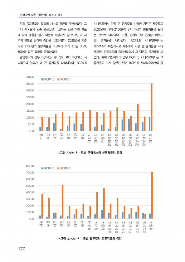 생태계에 대한 기후변화 리스크 평가 170 위의 종분포모형 결과의 시?도 평균을 계산하였다. 그 러나 시?도의 단순 평균값을 비교하는 것은 하천 분포 에 따라 영향을 받기 때문에 적당하지 않으므로, 각 지 역의 연도별 상대적 증감을 비교하였다. 2020년을 기준 으로 2100년의 분포확률을 비교하여 아래 그림 3.99, 100 과 같은 결과를 도출하였다. 큰입배스의 경우 RCP4.5 시나리오 보다 RCP8.5 시 나리오의 결과가 더 큰 증가값을 나타내었다. RCP4.5 시나리오에서 가장 큰 증가값을 나타낸 지역은 제주도로 2020년에 비해 2100년에 2배 이상의 분포확률을 보이 는 것으로 나타냈다. 또한, 전라북도와 전라남도에서도 큰 증가율을 나타냈다. RCP8.5 시나리오에서는 RCP4.5와 마찬가지로 ...