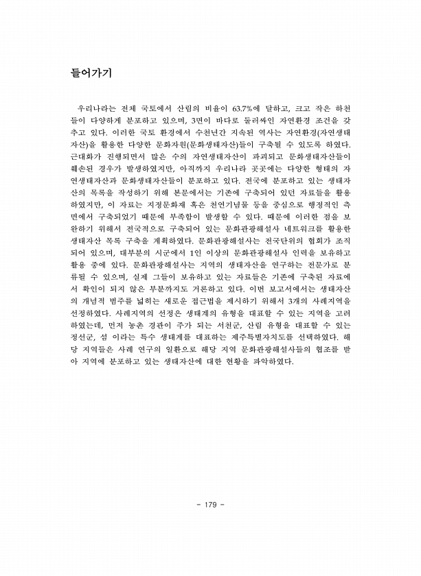 179 들어가기 우리나라는 전체 국토에서 산림의 비율이 에 달하고 크고 작은 하천 들이 다양하게 분포하고 있으며 면이 바다로 둘러싸인 자연환경 조건을 갖 추고 있다 이러한 국토 환경에서 수천년간 지속된 역사는 자연환경 자연생태 자산 을 활용한 다양한 문화자원 문화생태자산 들이 구축될 수 있도록 하였다 근대화가 진행되면서 많은 수의 자연생태자산이 파괴되고 문화생태자산들이 훼손된 경우가 발생하였지만 아직까지 우리나라 곳곳에는 다양한 형태의 자 연생태자산과 문화생태자산들이 분포하고 있다 전국에 분포하고 있는 생태자 산의 목록을 작성하기 위해 본문에서는 기존에 구축되어 있던 자료들을 활용 하였지만 이 자료는 지정문화재 혹은 천연기념물 등을 중심으로 행정적인 측 면에서 구축되었기 때문에 부족함이 발생할 수 있다 때문...