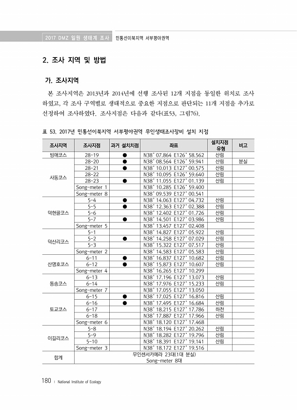 2017 DMZ 일원 생태계 조사 민통선이북지역 서부평야권역 180 ? National Institute of Ecology 2. 조사 지역 및 방법 가. 조사지역 본 조사지역은 2013년과 2014년에 선행 조사된 12개 지점을 동일한 위치로 조사 하였고, 각 조사 구역별로 생태적으로 중요한 지점으로 판단되는 11개 지점을 추가로 선정하여 조사하였다. 조사지점은 다음과 같다 표53, 그림76 조사지역 조사지점 과거 설치치점 좌표 설치지점 유형 비고 빙애코스 28-19 ● N38? 07.864 E126? 58.562 산림 사동코스 28-20 ● N38? 08.564 E126? 59.941 산림 분실 28-21 ● N38? 10.013 E127? 00.575 산림 28-22 N38? 10.095 E126? 5...
