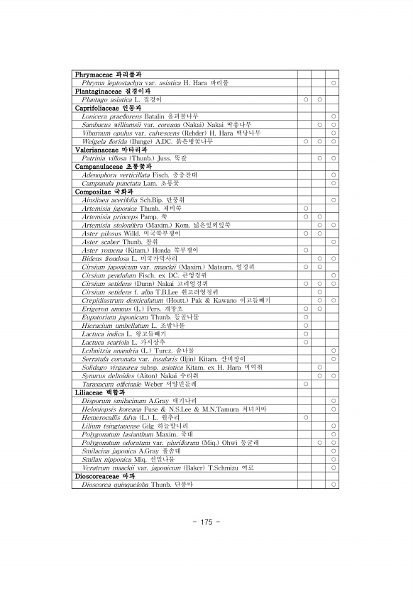 175 Phrymaceae 파리풀과 Phryma leptostachya var. asiatica H. Hara 파리풀 ○ Plantaginaceae 질경이과 Plantago asiatica L. 질경이 ○ ○ Caprifoliaceae 인동과 Lonicera praeflorens Batalin 올괴불나무 ○ Sambucus williamsii var. coreana Nakai Nakai 딱총나무 ○ ○ Viburnum opulus var. calvescens Rehder H. Hara 백당나무 ○ Weigela florida Bunge A.DC. 붉은병꽃나무 ○ ○ ○ Valerianaceae 마타리과 P atrinia villosa Thunb. Juss. 뚝갈 ○ ○ Campanulaceae 초롱꽃과 Ad...