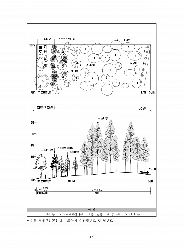 173 자 전 거 도 로 0m 녹지 1m 5m 15m 10m 20m 공원 0m 1m 보 도 2.8m5m 50m 1m 2.8m5m 50m 자전거 도로 2.2m 보도 1.8m 마운딩 녹지 45m 느티나무 20m 중국단풍 스트로브잣나무 느티나무 벚나무 차도 8차선 47m 5 5 2 2 2 2 2 2 2 2 2 2 2 3 3 3 3 3 3 3 3 3 3 4 4 4 1 1 1 1 1 1 1 1 1 1 1 1 1 1 1 1 1 1 1 1 1 1 25m 소나무 무궁화 소나무 벚나무 스트로브잣나무 중국단풍 무궁화 범 례 1.소나무 2.스트로브잣나무 3.중국단풍 4. 벚나무 5.느티나무 ?수원 샘내근린공원-2 가로녹지 수관평면도 및입면도