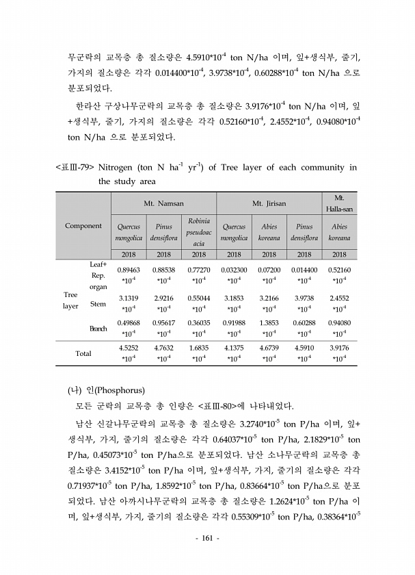 161 무군락의 교목층 총 질소량은 4.5910*10-4 ton N/ha 이며, 잎+생식부, 줄기, 가지의 질소량은 각각 0.014400*10-4, 3.9738*10-4, 0.60288*10-4 ton N/ha 으로 분포되었다. 한라산 구상나무군락의 교목층 총 질소량은 3.9176*10-4 ton N/ha 이며, 잎 +생식부, 줄기, 가지의 질소량은 각각 0.52160*10-4, 2.4552*10-4, 0.94080*10-4 ton N/ha 으로 분포되었다. Component Mt. Namsan Mt. Jirisan Mt. Halla-san Quercus mongolica Pinus densiflora Robinia pseudoac acia Quercus mongolica Abies koreana Pinus...