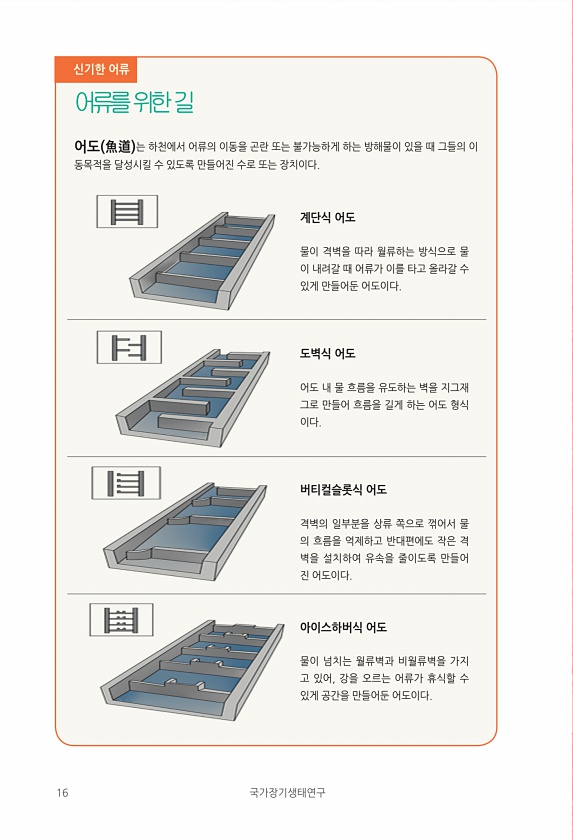 16 국가장기생태연구 신기한 어류 어도 魚道 는 하천에서 어류의 이동을 곤란 또는 불가능하게 하는 방해물이 있을 때 그들의 이 동목적을 달성시킬 수 있도록 만들어진 수로 또는 장치이다. 계단식 어도 물이 격벽을 따라 월류하는 방식으로 물 이 내려갈 때 어류가 이를 타고 올라갈 수 있게 만들어둔 어도이다. 도벽식 어도 어도 내 물 흐름을 유도하는 벽을 지그재 그로 만들어 흐름을 길게 하는 어도 형식 이다. 버티컬슬롯식 어도 격벽의 일부분을 상류 쪽으로 꺾어서 물 의 흐름을 억제하고 반대편에도 작은 격 벽을 설치하여 유속을 줄이도록 만들어 진 어도이다. 아이스하버식 어도 물이 넘치는 월류벽과 비월류벽을 가지 고 있어, 강을 오르는 어류가 휴식할 수 있게 공간을 만들어둔 어도이다. 어류를 위한길